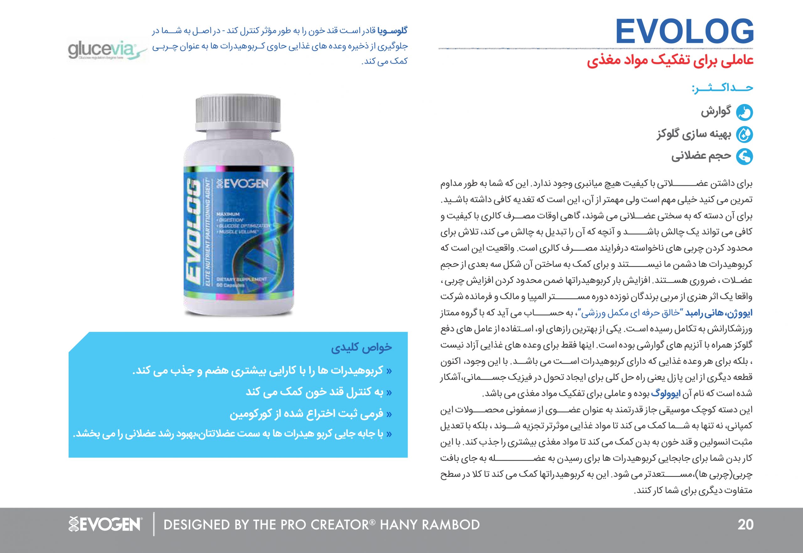 محصول EvoLog 60 Capsules یکی از مکمل‌های خاص Evogen است که به عنوان عامل تقسیم مواد مغذی (“nutrient partitioning agent”) شناخته می‌شود. منظور از تقسیم مواد مغذی این است که کاربوها، چربی‌ها و پروتئین‌ها نه به فرم ذخیره چربی بلکه به سمت عضله هدایت شوند. این مکمل برای کسانی طراحی شده که