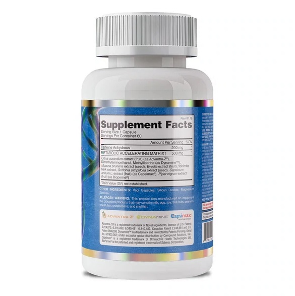 متابولیک اکسلریتینگ ماتریکس (Metabolic Accelerating Matrix) ~۵۰۸ میلی‌گرم ترکیبی از Citrus aurantium (Advantra-Z)، Dynamine™ (متیل-لیبورین)، DMAE، Mucuna Pruriens، Evodia Rutaecarpa، Yohimbe Bark، Griffonia simplicifolia، Capsicum Annuum (Capsimax)، Piper Nigrum (BioPerine) اثر هم‌افزا در چربی‌سوزی، کنترل اشتها، افزایش انرژی، بهبود جذب ترکیبات