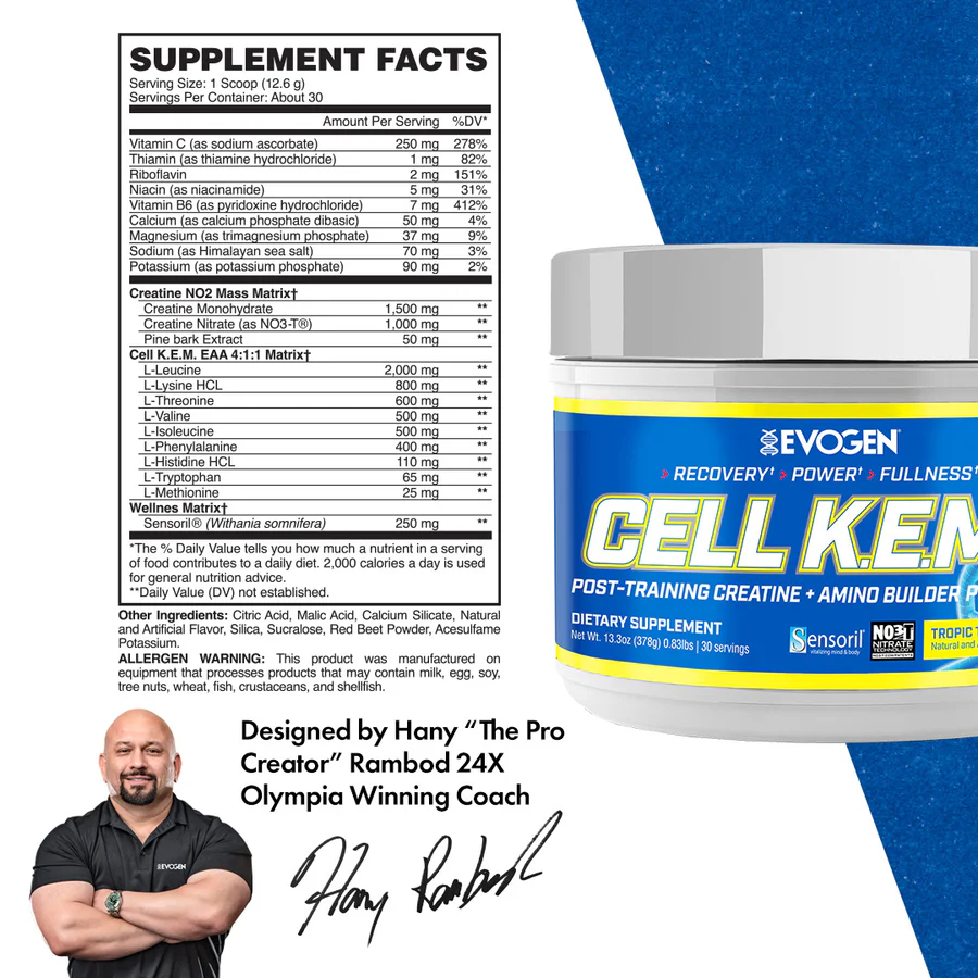 Cell K.E.M. PR (Pure Recovery) جدیدترین مکمل ریکاوری برند آمریکایی Evogen Nutrition است که برای افزایش سرعت بازسازی عضلات، بهبود پمپ، افزایش حجم سلولی و حمایت از رشد عضلانی طراحی شده است. این محصول با ترکیب منحصر‌به‌فرد BCAA با نسبت 4:1:1، آمینواسیدهای ضروری (EAA)، کراتین نیترات (NO3T®)، بتائین، گلیسرول و عصاره‌های گیاهی ثبت‌شده، بهترین انتخاب برای ریکاوری حرفه‌ای بعد از تمرین است.